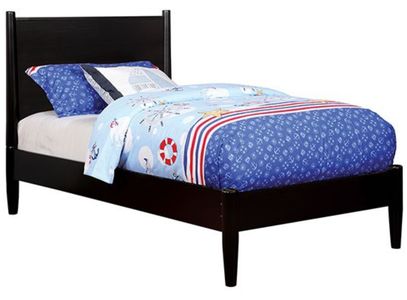 For a quick modern update to your home, this collection will add that trendy mid-century appeal. Featuring a sleek black finish and wooden headboard, this panel bed is complete in a platform style with an included mattress ready slat kit. Coordinating case goods boast slim flared legs and recessed handle drawer pulls.Read More