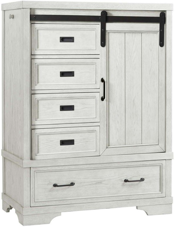 This chiffrobe features a timeless farmhouse style with a soft white finish. Crafted from solid hardwood, it includes five spacious drawers and a sliding door, offering durable construction and ample storage for an organized bedroom.Read More