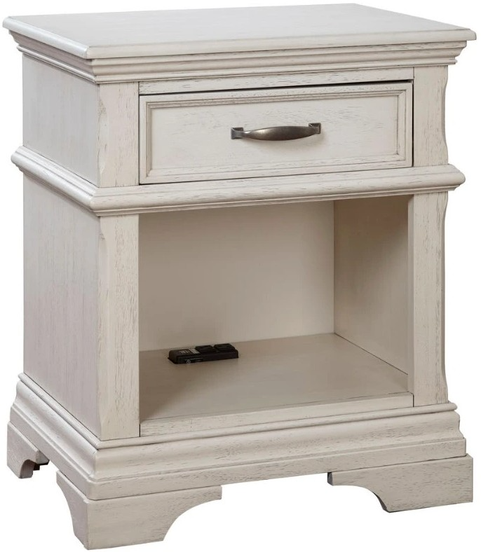This nightstand features a warm rustic white finish with elegant detailing. Compact yet functional, it offers a drawer and open shelf for storage, combining style and practicality for any nursery or bedroom.Read More